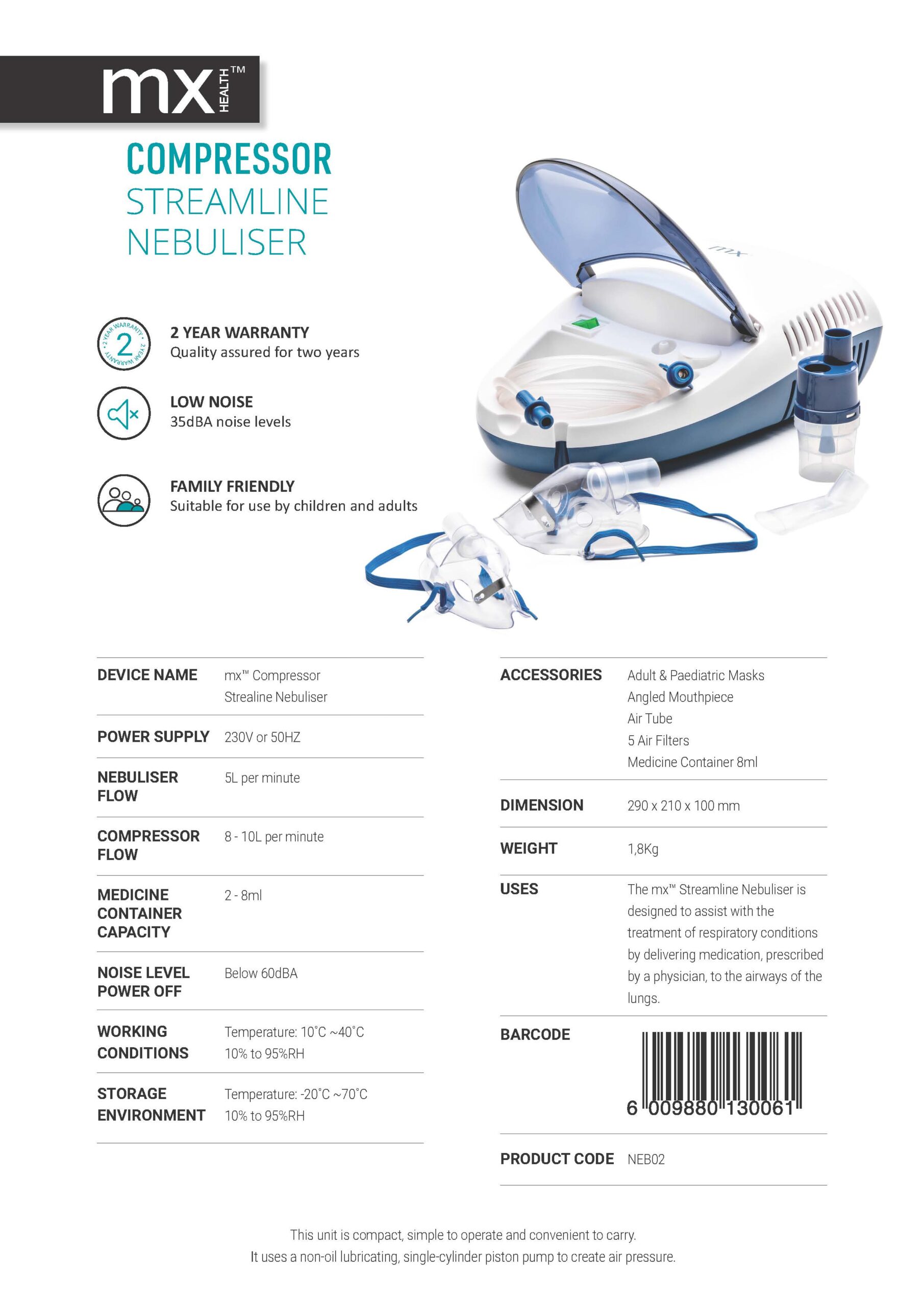 The MX Health Streamline Nebulizer is a user-friendly and compact device. This comprehensive nebulizer kit features a dedicated storage compartment to securely keep masks and components for convenient access during the next use. With one-button operation, the device is hassle-free, while its built-in technology ensures uniform particle sizes for effective and deep diffusion into the lungs. Designed with a low noise level, it is suitable for family use.